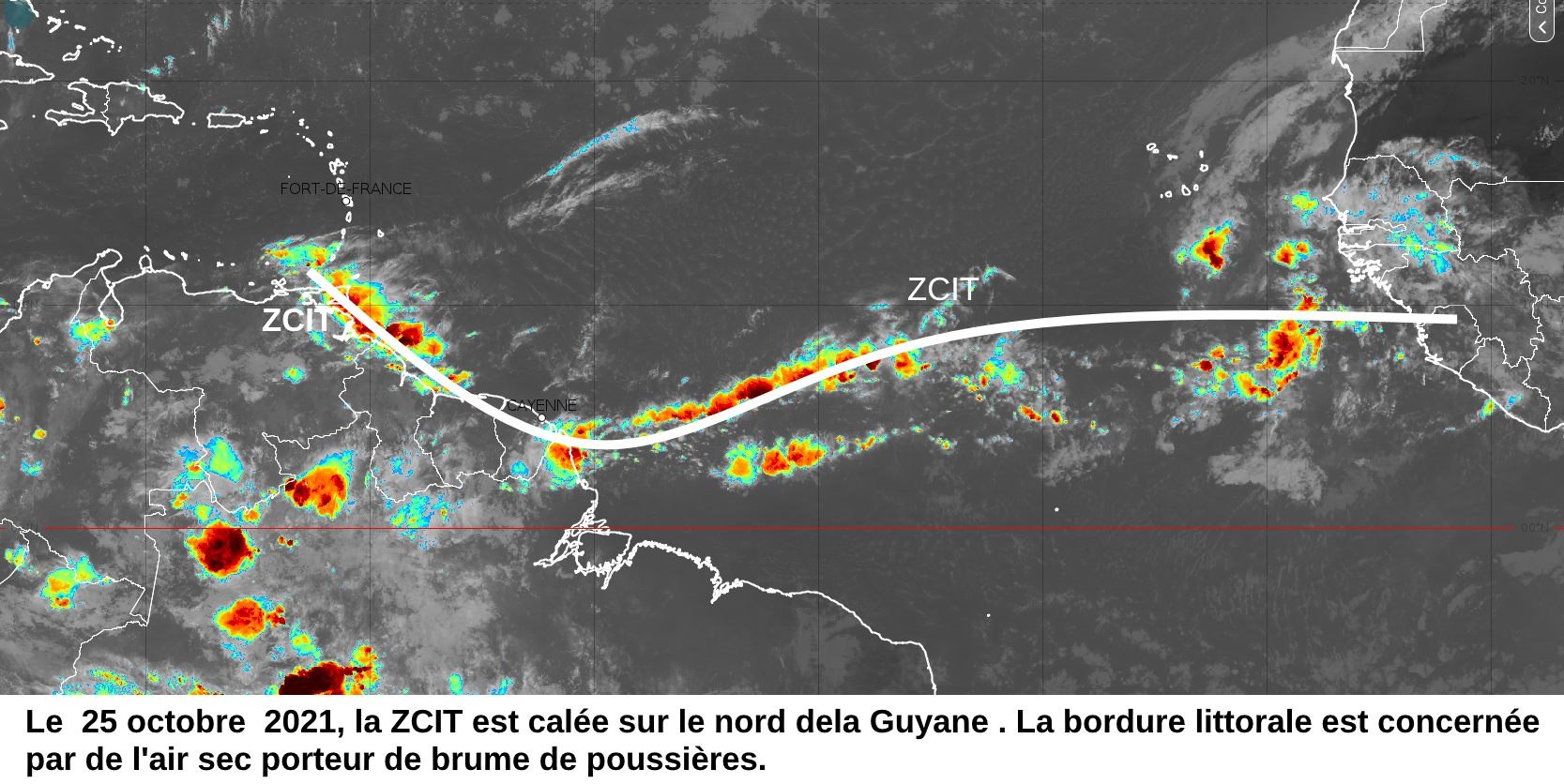 Depuis la fin octobre la ZCIT évolue au niveau de la Guyane , son activité reste peu marquée, on n'observe pas encore d'épisodes pluvieux significatifs mais des arrosages réguliers.