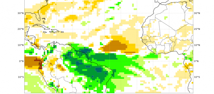 Sur cette carte de prévisions saisonnières pour la période novembre, décembre et janvier, les couleurs vertes sont associées  à  une pluviométrie plus importante que la normale tandis qu'à l'inverse les couleurs jaune, orange et marron correspondent  à  un déficit pluviométrique.  On voit bien que la Guyane se situe dans le vert foncé, le signal est très net.