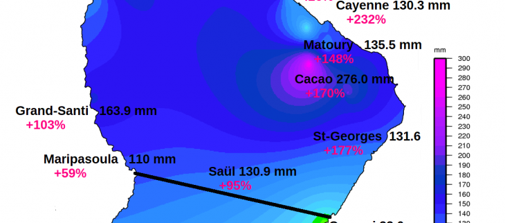 Entre le premier et le 9 novembre, la plupart des communes de Guyane recueillent des cumuls pluvieux supérieurs  à 50mm , on dépasse même les  80mm à Cacao et Régina. Cette proximité de la ZCIT observée en août septembre et jusqu'à la mi-octobre puis son retour  à nos latitudes à partir de la fin octobre s'explique par une anomalie de températures de surface de l'océan dans le bassin atlantique équatorial.
