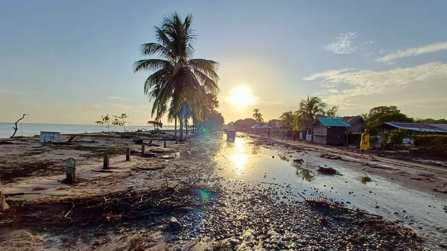 L’image ci-dessous montre une route départementale sous les eaux le 4 avril 2025 dans le secteur de Mana.
