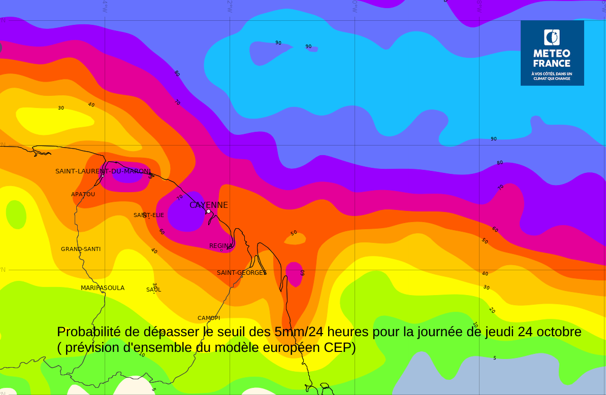 En cette fin de semaine, de vendredi 18 à dimanche 20 octobre, la marge sud de la Zone de Convergence Inter Tropicale déborde jusque sur le littoral guyanais, le risque d'averses monte d'un cran et on pourra voir passer quelques petites ondées de fins de nuit sur le littoral ainsi que quelques averses continentales les après-midi de part et d'autre de l'axe reliant Saint-Georges à Saint-Laurent. Ces phénomènes très localisés n'apporteront que des cumuls pluvieux bien modestes et laisseront de nombreux secteurs au sec. Il ne faut s'attendre à un d'impact significatif sur le déficit pluviométrique aggravé que la Guyane connait en ce moment.
