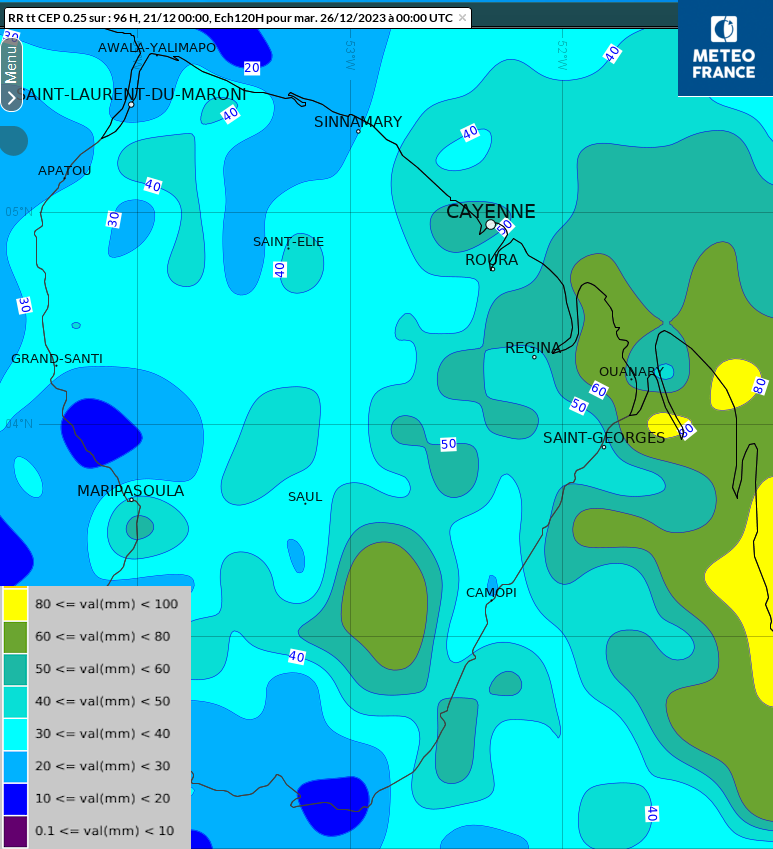 La carte ci-dessus montre une estimation des cumuls prévus tout au long du week-end de Noël ( de vendredi 22 à lundi 25 décembre inclus). Ces cumuls ne présentent qu'un caractère estimatif. Ils montrent tout de même que si l'on attend des pluies un peu plus conséquentes dans le nord-est (de la route de l'est à L'ile de Cayenne) et plus faibles sur la pointe nord-ouest (Mana et Awala-Yalimapo), aucun secteur ne sera véritablement à l'abri des averses pour ce premier long week-end des fêtes de fin d'année.
