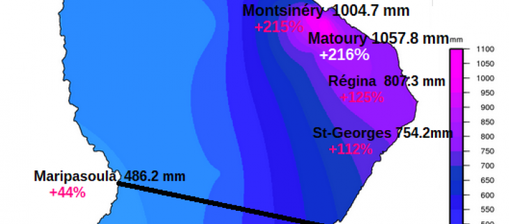 La période du 1er au 11 mars a été très pluvieuse sur l'ensemble du bassin du Maroni avec des cumuls estimés entre  250 et 350mm. Pendant cette période, les  4 postes climatologiques principaux du secteur ne connaissent pas de jours sans précipitations, on distingue même une période exceptionnellement plus pluvieuse  du 5 au 10 mars pendant laquelle on relève 255mm à Maripa-Soula.