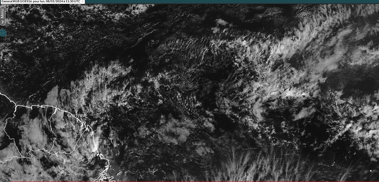 Depuis le 30 décembre2023 , la descente vers l'équateur de la ZCIT a favorisé la mise en place d'une masse d'air sèche sur la Guyane. On a parfois pu observer la présence d'une brume de poussières peu dense. La journée de vendredi 5 janvier nous a apporté un regain temporaire d'instabilité mais la forte humidité de ce jour là se limitait aux basses couches de l'atmosphère; l'air sec encore présent en altitude a atténué l'intensité des averses. Ce week-end (du 6 au 7 janvier) est resté très sec mais sous un ciel parfois nuageux ( encore un peu d'humidité piégée dans les basses couches de l'atmosphère). Au final cette première semaine de l'année 2024 se révèle particulièrement sèche avec une pluviométrie bien inférieure à ce que l'on peu attendre d'un début janvier ( statistiquement, la position moyenne de la ZCIT est à notre latitude en début d'année avec pour conséquences des cumuls pluvieux significatifs). On se serait presque cru au petit été de mars.