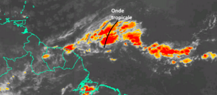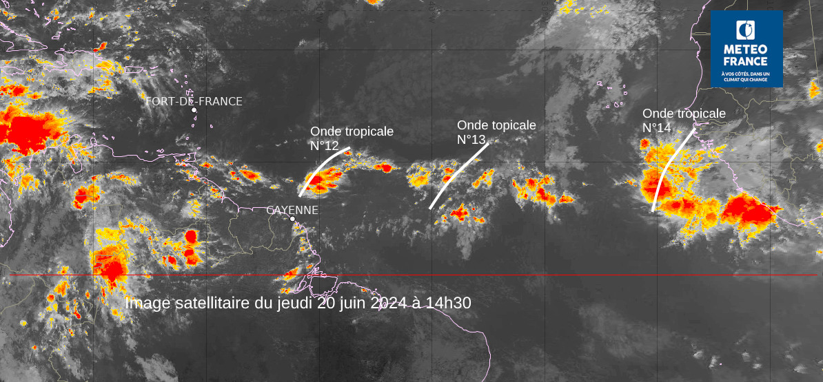 20/06/2024Depuis le début du mois de juin, pas moins de 8 ondes tropicales sont passées au large du littoral guyanais, rythmant ainsi les changements de temps sur la Guyane. Cette situation perdure la semaine prochaine, mais avec la remontée progressive de la Zone de Convergence Inter tropicale vers le Nord, l'influence des ondes tropicales ira en s'atténuant avec pour conséquence sur la Guyane des arrosages devenant moins fréquents.