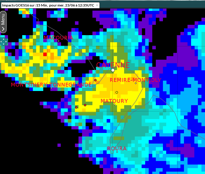 Cette image montre le coeur de l'orage centré sur Matoury avec les cumuls les plus forts sur Balata et le secteur de la chaumière. De nombreux impacts de foudre sont relevés dans le secteur de la Chaumière, Balata et du Larivot.