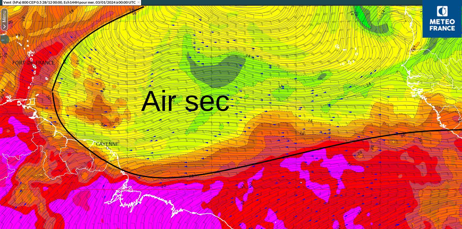 En effet, un très net assèchement s'amorce sur le littoral dès samedi midi et gagne progressivement l'ensemble de la Guyane dimanche. La Zone de Convergence Inter tropicale se rabat vers le sud (embouchure de l'Amazone) samedi en journée, et une masse d'air très sec gagne la Guyane dans un flux d'est Nord-Est. De bonnes conditions météorologiques sont donc attendues pour la nuit de la Saint Sylvestre avec un temps sec prévu sur l'ensemble de la Guyane.
