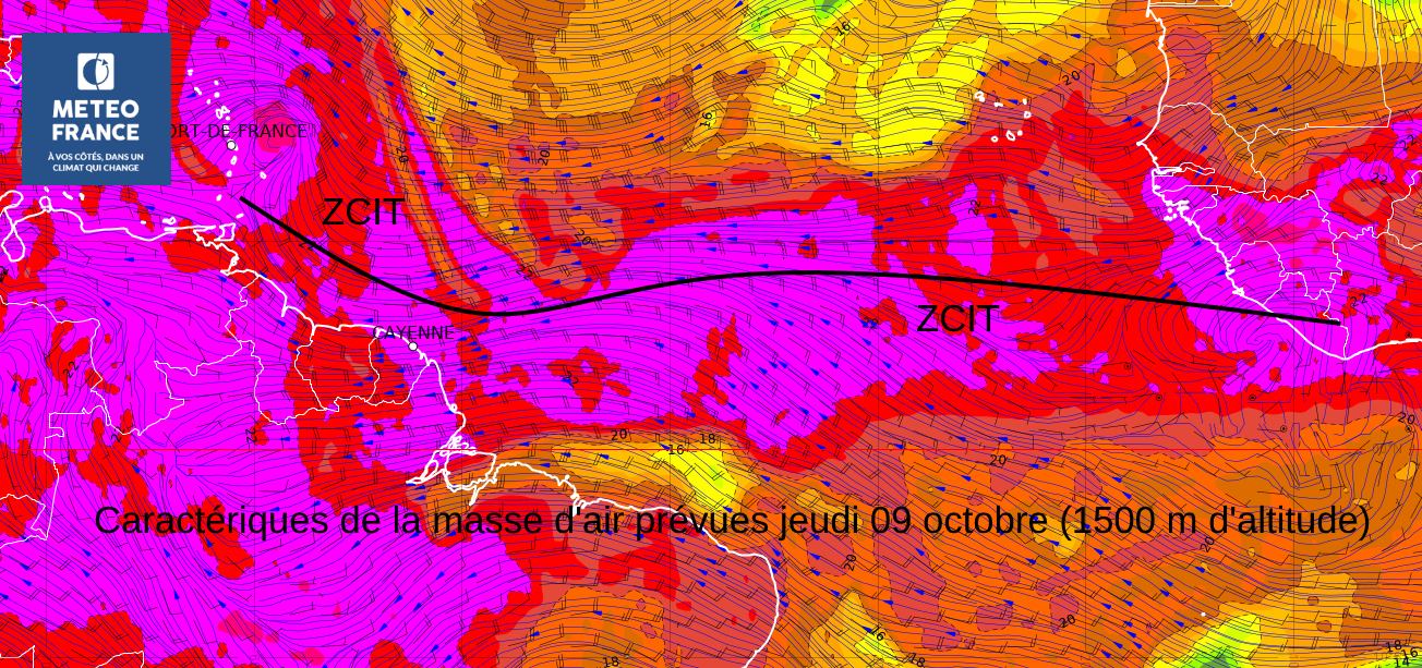 Pour les températures minimales, seul Saül est passé sous la barre des 20 degrés avec 19.4°C relevés au petit jour le 25 septembre 2025. Dans les années 1960/1970, cela arrivait généralement plus d'un jour sur 2 d'observer une température minimale en dessous de 20 degrés à Saül. On a bien là une illustration du changement climatique avec une tendance nette au réchauffement sur la Guyane.