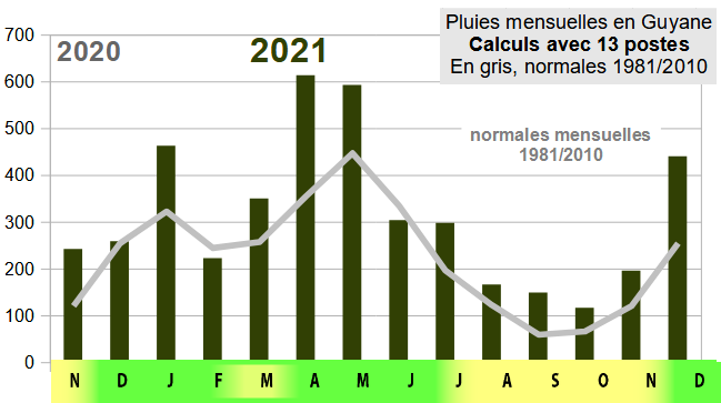 En DECEMBRE, de nombreuses communes ont enregistré une pluviométrie record pour un mois de décembre: 903,0mm à Kaw / 847,1mm à Roura / 796,9mm à St-Georges, entre autres...