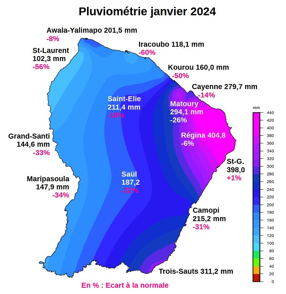Depuis 9 mois maintenant, le département connaît des pluies en dessous des normales : Les 220,4mm de pluie tombés en moyenne* en janvier 2024 représentent un déficit de 26 %. Les postes de Kourou-CSG, Sinnamary, Apatou, Charvein et Saint-Laurent ont connu des pluies de 50 à 55 % sous les normales, et Iracoubo atteint même les 60 % de déficit avec 118,1mm contre un cumul moyen de 298,3mm. On reste malgré cela bien loin du record sec d’Iracoubo et ses 34,0mm tombés en janvier 1973. Avec 398,0mm tombés sur Saint-Georges, la station est la seule a atteindre une pluviométrie normale (+1%). Les stations les plus arrosées ce mois sont Régina (404,8mm) et Montagne de Kaw (412,2mm). Enfin, sur les 279,7mm de pluie de Cayenne-Suzini, plus d’un tiers est tombé sur la journée du 29/01 (103,4mm).