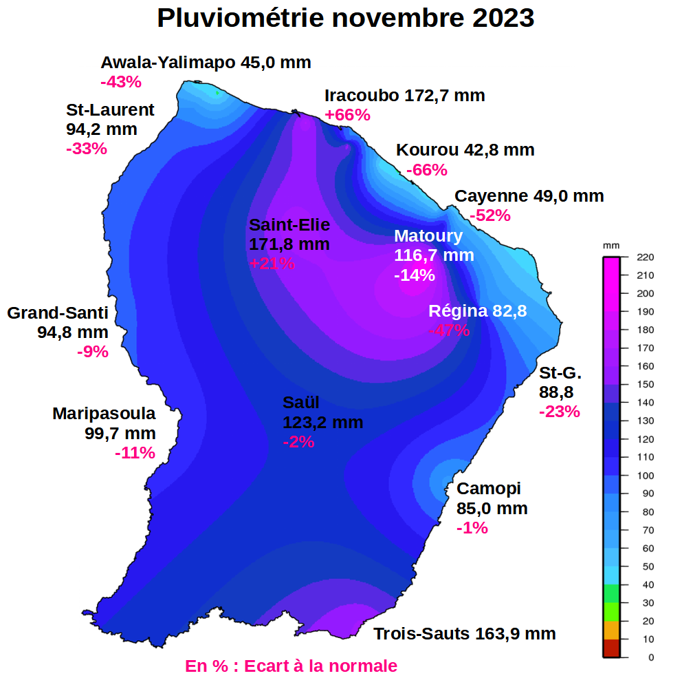 Depuis le mois de mai, la pluviométrie est inférieure aux normales en Guyane. Le mois de novembre ne fait pas exception : Avec 94,2mm de pluie tombée en moyenne*, le département est déficitaire de 17 %. Les cumuls des deux premières décades du mois ont été particulièrement déficitaires et c’est lors de la dernière décade que le département a retrouvé une pluviométrie proche de la normale pour ce début de saison des pluies. Seules trois stations ont connu des pluies excédentaires, il s’agit d’ailleurs des stations les plus pluvieuses du mois : Cacao avec 213,5mm (+19%), Saint-Elie avec 171,8mm (+21%) et Iracoubo avec 172,7mm (+66 % tout de même). En revanche pour cinq postes, il a plu moins de la moitié de la normale (Cayenne, Île Royale, Tonate, Kourou Plage et CSG).
