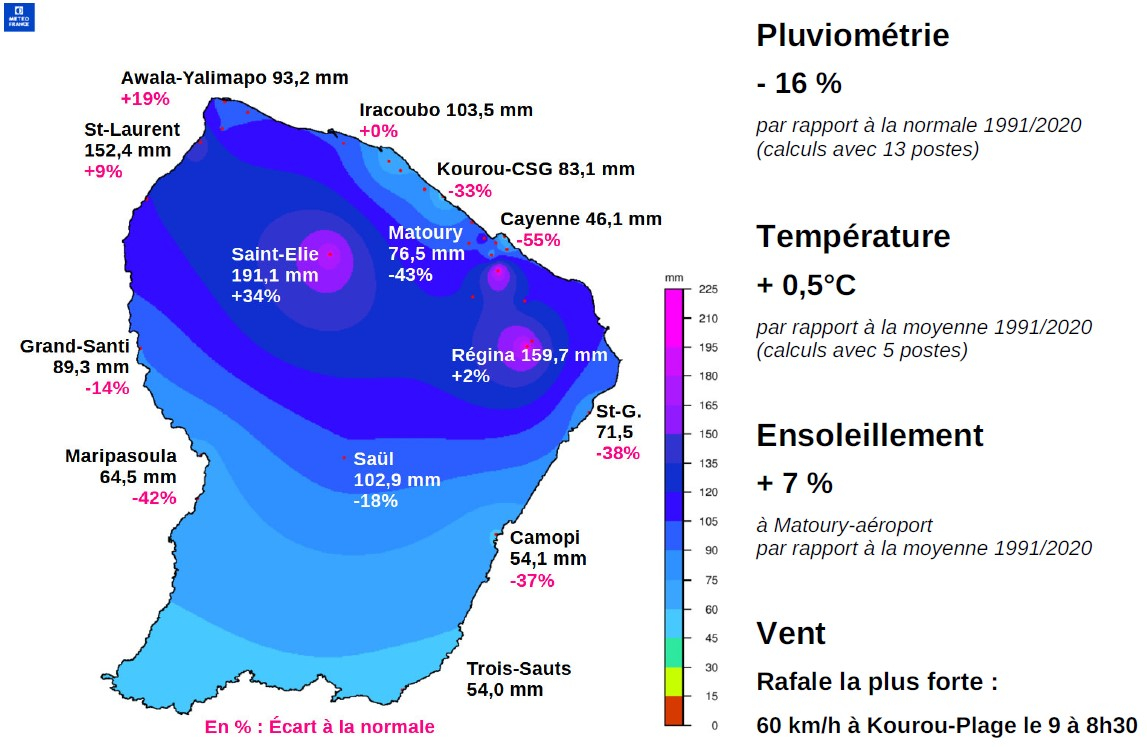 En novembre, la Zone de Convergence Inter-Tropicale (ZCIT) se positionne entre la Guyane et le 9°N, de rares incursions se produisent sur le continent principalement en début de mois, apportant quelques épisodes de pluie. Le cumul moyen est de 99.1 mm, soit un déficit de 16 % par rapport à la normale tandis que les températures restent toujours supérieures à la normale avec +0.5°C. L’ensoleillement ne s’écarte pas beaucoup de la norme (+7%).