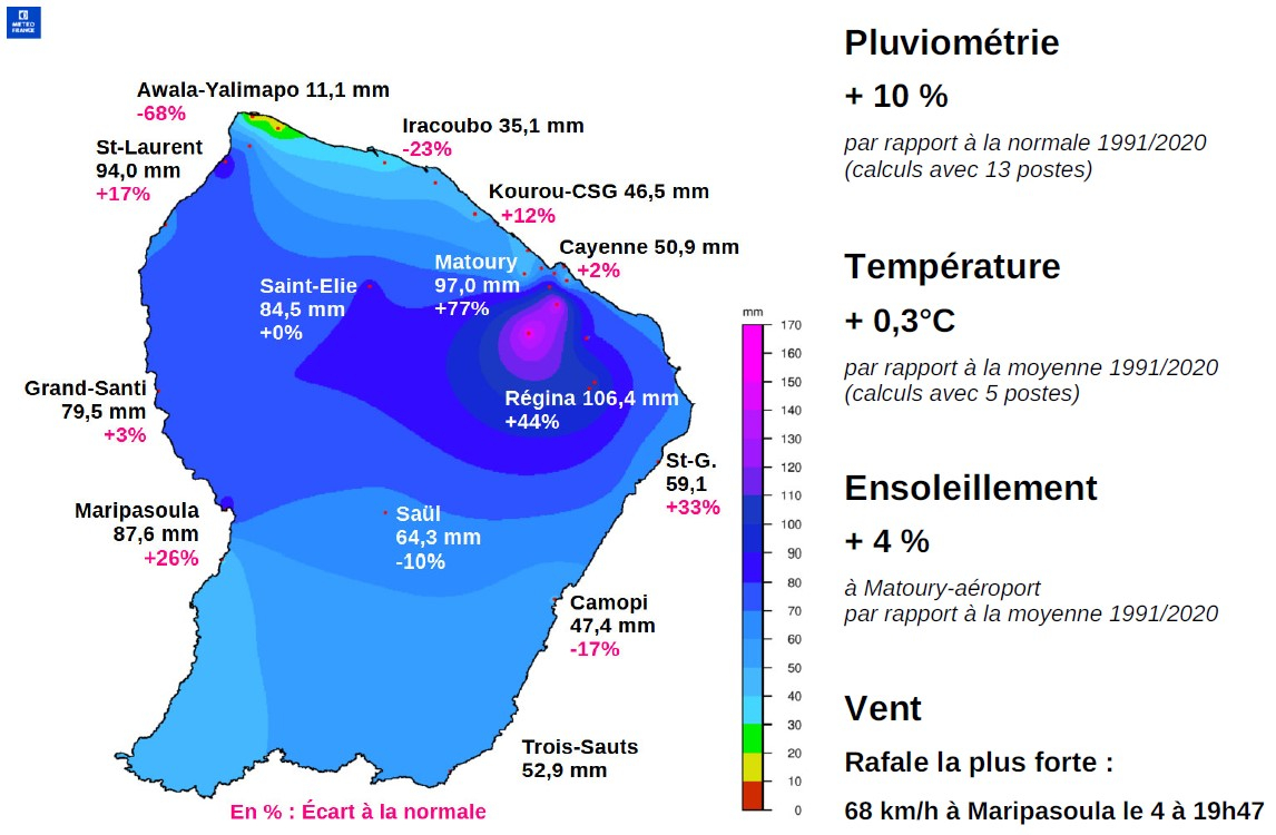 Les cumuls ont été excédentaires de +77 et +86 % à Cayenne-Matoury et Roura.