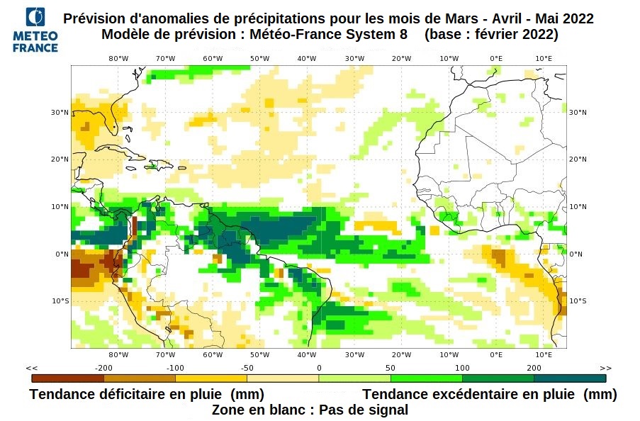 Sur cette carte issue du modèle de prévision Météo-France System 8, le prochain trimestre s'annonce une fois de plus excédentaire sur la Guyane et sur une grande partie du bassin atlantique équatorial.