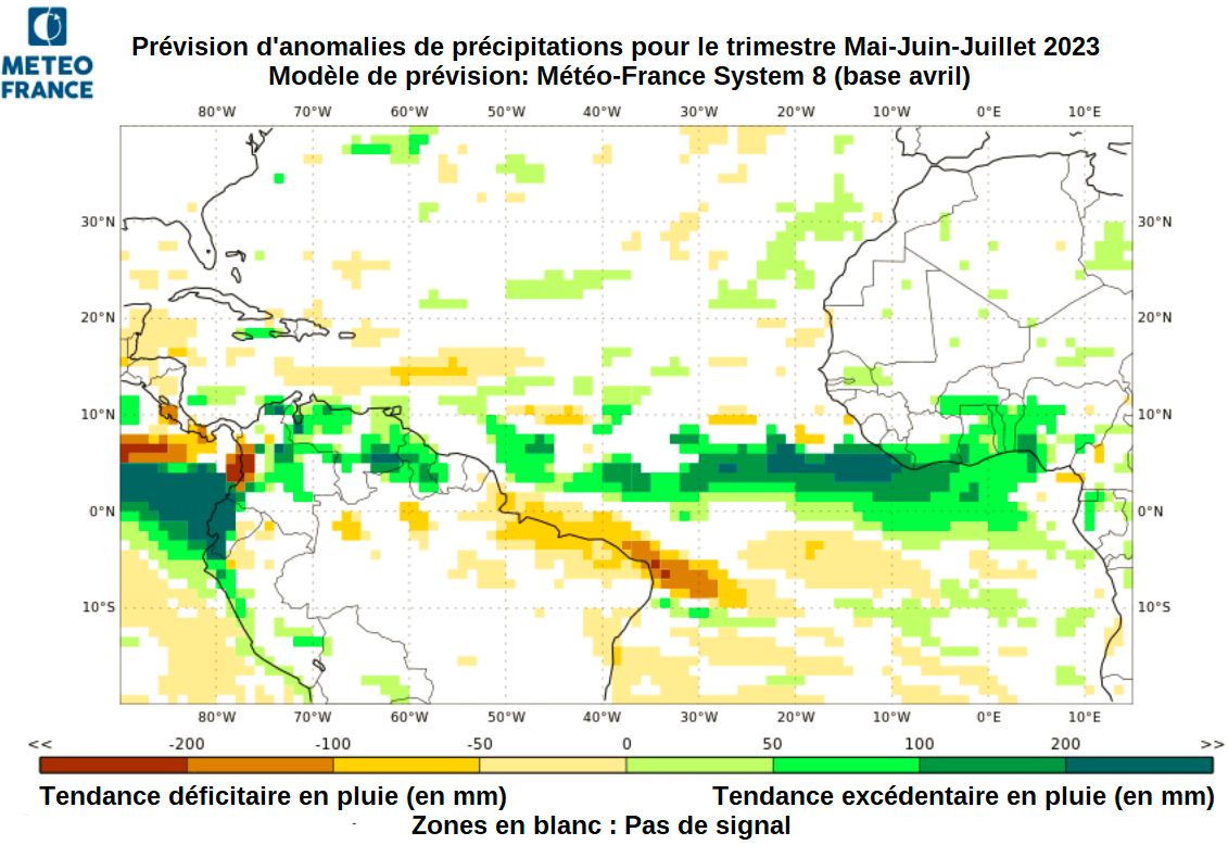 C'est le cas du modèle de Météo-France pour la prévision du prochain trimestre, aucune tendance ne se démarque suffisamment pour être validée (= pas de signal pour la Guyane, celle-ci apparait en blanc sur la carte ci-dessous).