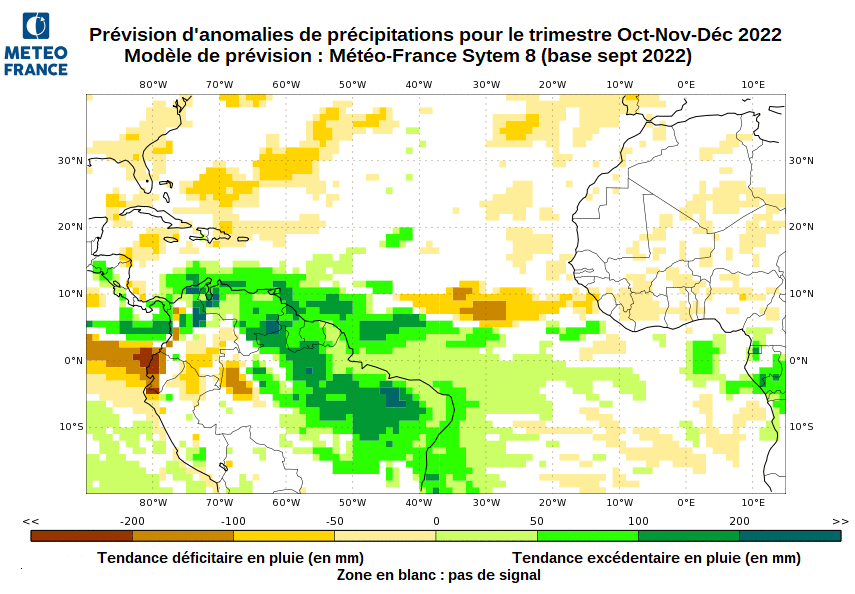 06/10/2022Le phénomène la Nina se maintient encore et toujours avec les répercussions que l'on connait bien sur notre région... Un excédent de pluie est encore attendu le trimestre prochain ! Les températures sont quant à elles prévues supérieures aux normales.