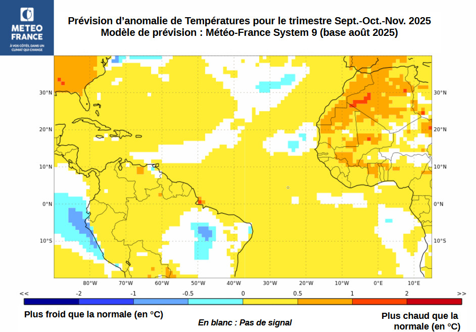 Le trimestre septembre-octobre-novembre 2025 est prévu légèrement plus arrosé que la normale, notamment sur le littoral guyanais. Les températures devraient être supérieures aux normales.