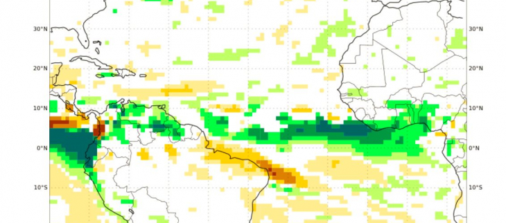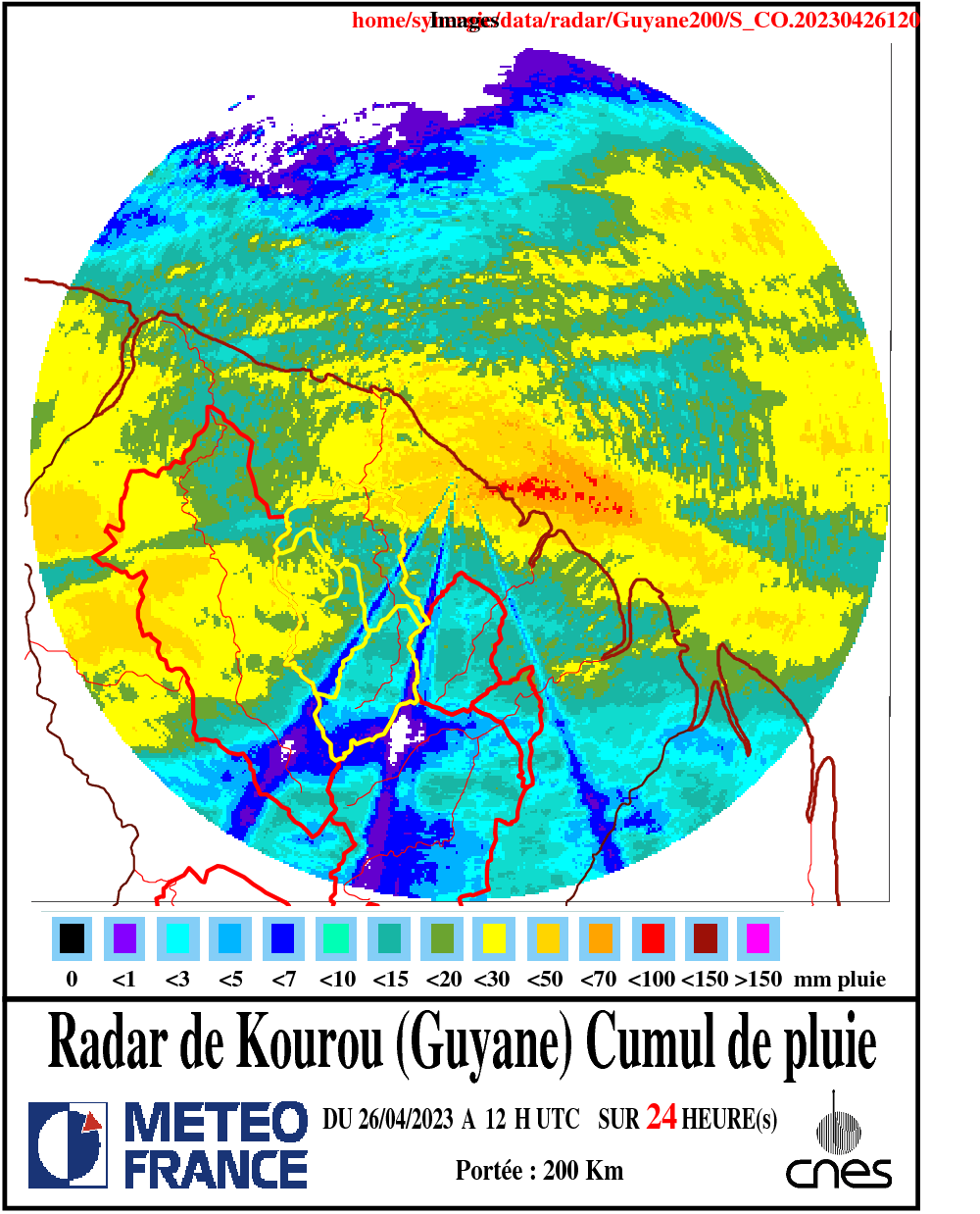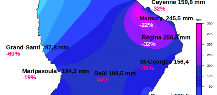 Du 20 au 26, la présence de l’EMA à la latitude de la Guyane entretient le régime d’averses sur l’ensemble du territoire avec même sur le littoral un dernier pic d’activité pluvieuse lié à une ondulation au sein de l’EMA, du 25 au 26. Pour cette période, les cumuls les plus significatifs sont : 58 mm à Apatou, 63 mm à Trois-Sauts et 64 mm à Grand-Santi le 21, 90 mm à Montsinéry le 22, 55 mm à Iracoubo et 63 mm à Saint-Laurent le 23 et lors du pic d’activité pluvieuse 171 mm relevés à Cayenne du 25 au 26. Du 27 au 30, la descente progressive de l’EMA vers l’équateur favorise une tendance généralisée à l’assèchement avec comme seuls cumuls pluvieux notables 35 mm à Apatou le 29 et 16 mm à trois-Sauts le 30.