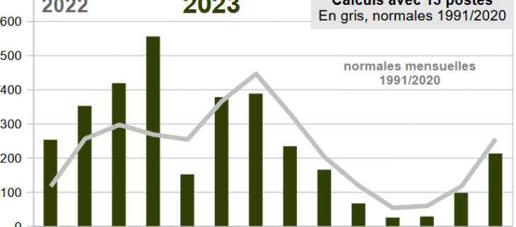Les précipitations mensuelles de ce mois de février 2024 atteignent 106,7 mm, ce qui représente un impressionnant déficit de près de 70 % par rapport à la normale pluviométrique de 334,8 mm.