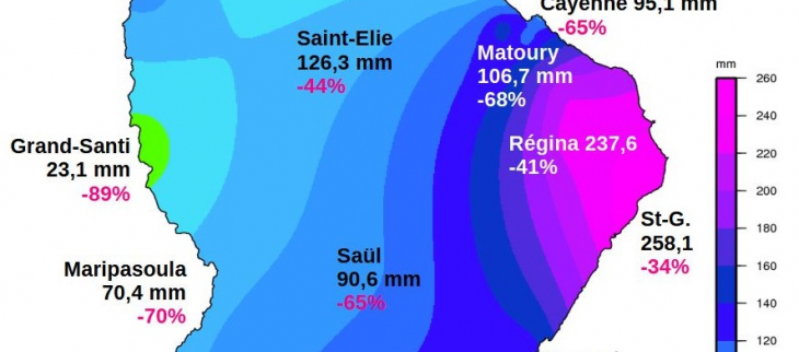 Ce mois de mars 2024 se distingue aussi par les températures nettement plus élevées que la normale. Les nuits sont douces avec un écart positif à la normale atteignant souvent plus d’1 degré pour les températures minimales. Les températures maximales observées en après-midi dépassent la normale de plus d’1 degré sur le littoral tandis que dans la Guyane de l’intérieur l’écart est encore plus important et dépasse les 2 degrés. Le bourg de Cacao et la vallée du Maroni ont connu des températures maximales particulièrement élevées avec une moyenne des températures maximales de 33,6 degrés à Cacao et de plus de 34 degrés à Saint-Laurent, Taluen et Grand-Santi.