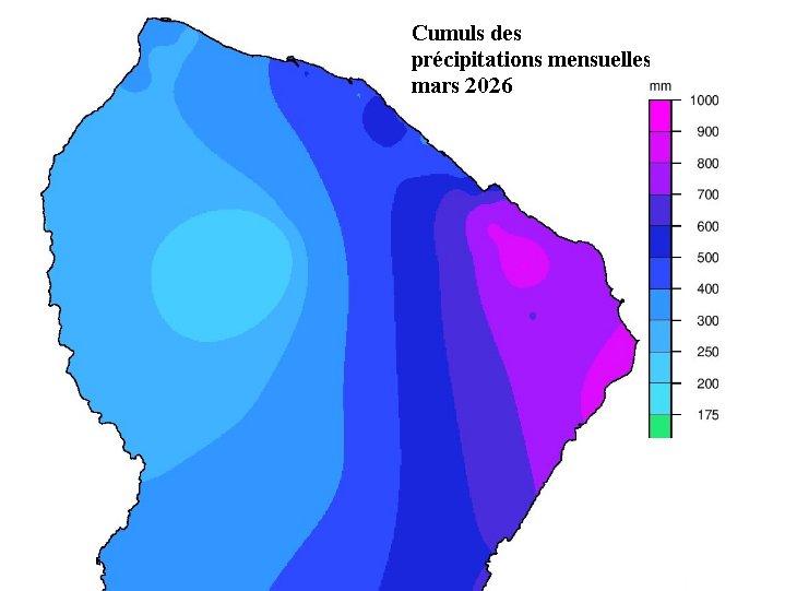 Ce mois de mars se rapproche donc plus d’un début de saison des pluies par les cumuls reçus, la forte nébulosité et le nombre de jours d’orage dans l’intérieur (25), même si la position de la Zone Intertropicale de Convergence reste encore souvent au Sud du département. La forte nébulosité a limité l’amplitude thermique, avec des températures nocturnes légèrement supérieures à la normale et des températures maximales plus basses en journée.