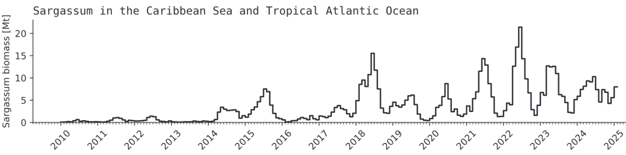 La population de sargasses de l'Atlantique tropical varie tout au long de l'année, mais il existe également une forte variabilité d'une année à l'autre.