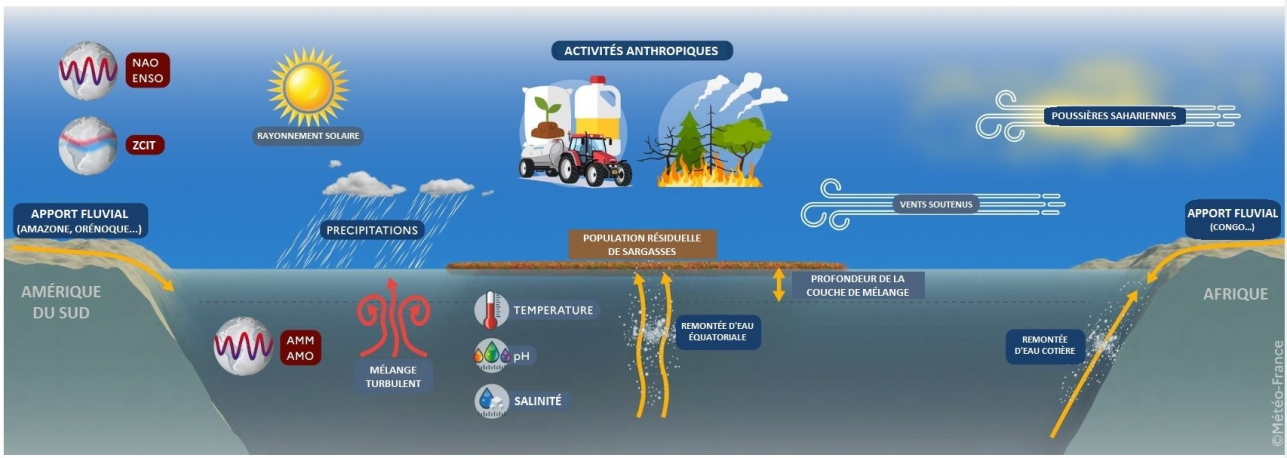 Cette variabilité est liée à de grands modes climatiques de l'Atlantique (des variations cycliques, plus ou moins longues, de températures de surface de l'océan, comme l'AMM2, l'AMO3, l'ENSO4), qui modifient vents, températures et disponibilité en nutriments. Les interactions entre ces modes vont donc fortement influencer les proliférations de sargasses.