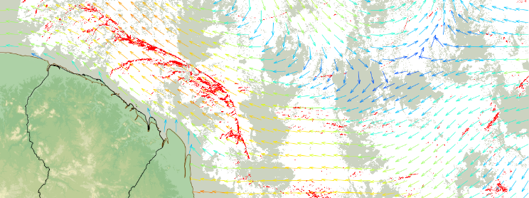 Les images satellitaires acquises ces dernières semaines montrent des radeaux de sargasses se décrochant du courant des Guyanes — un courant océanique de surface longeant le plateau continental — pour dériver perpendiculairement vers le littoral. Ce changement de trajectoire est principalement dû à l'action du vent sur les radeaux de sargasses.